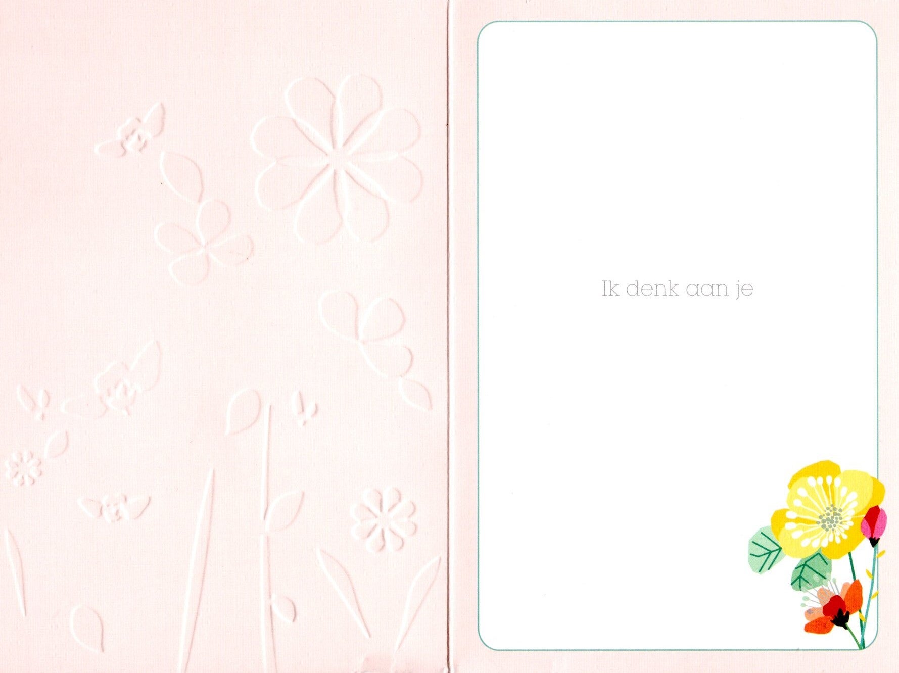 Luxe dubbele kaart met foliebewerking en envelopBinnenzijde bedrukt met afbeelding en de tekst 'Ik denk aan je '.