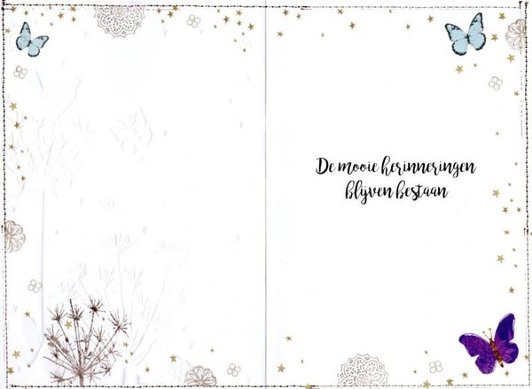 Luxe dubbele kaart met foliebewerking en envelopBinnenzijde bedrukt met afbeelding en de tekst 'De mooiste herinneringen blijven bestaan'.
