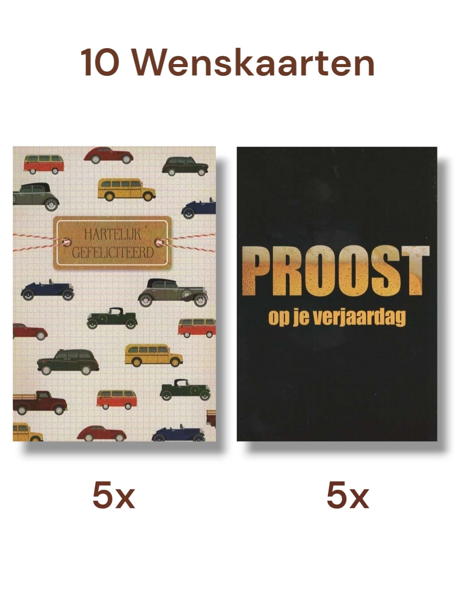 Pakket met 10 (2x 5 st.) Felicitatie wenskaarten met gekleurde envelop, afm circa 11,5 x 17 cm.