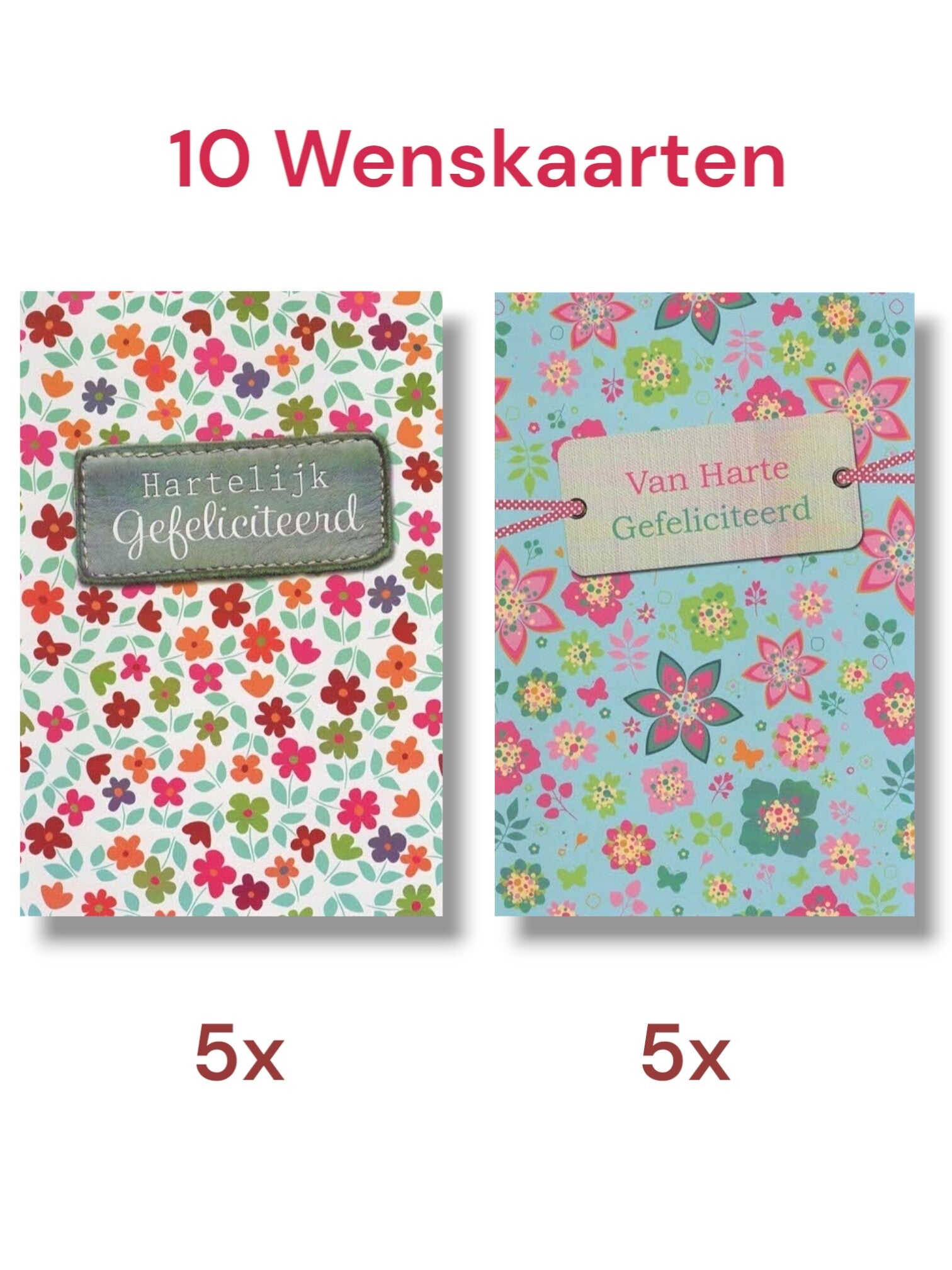 Pakket met 10 (2× 5 st.) Felicitatie wenskaarten met gekleurde envelop, afm circa 11,5 x 17 cm.