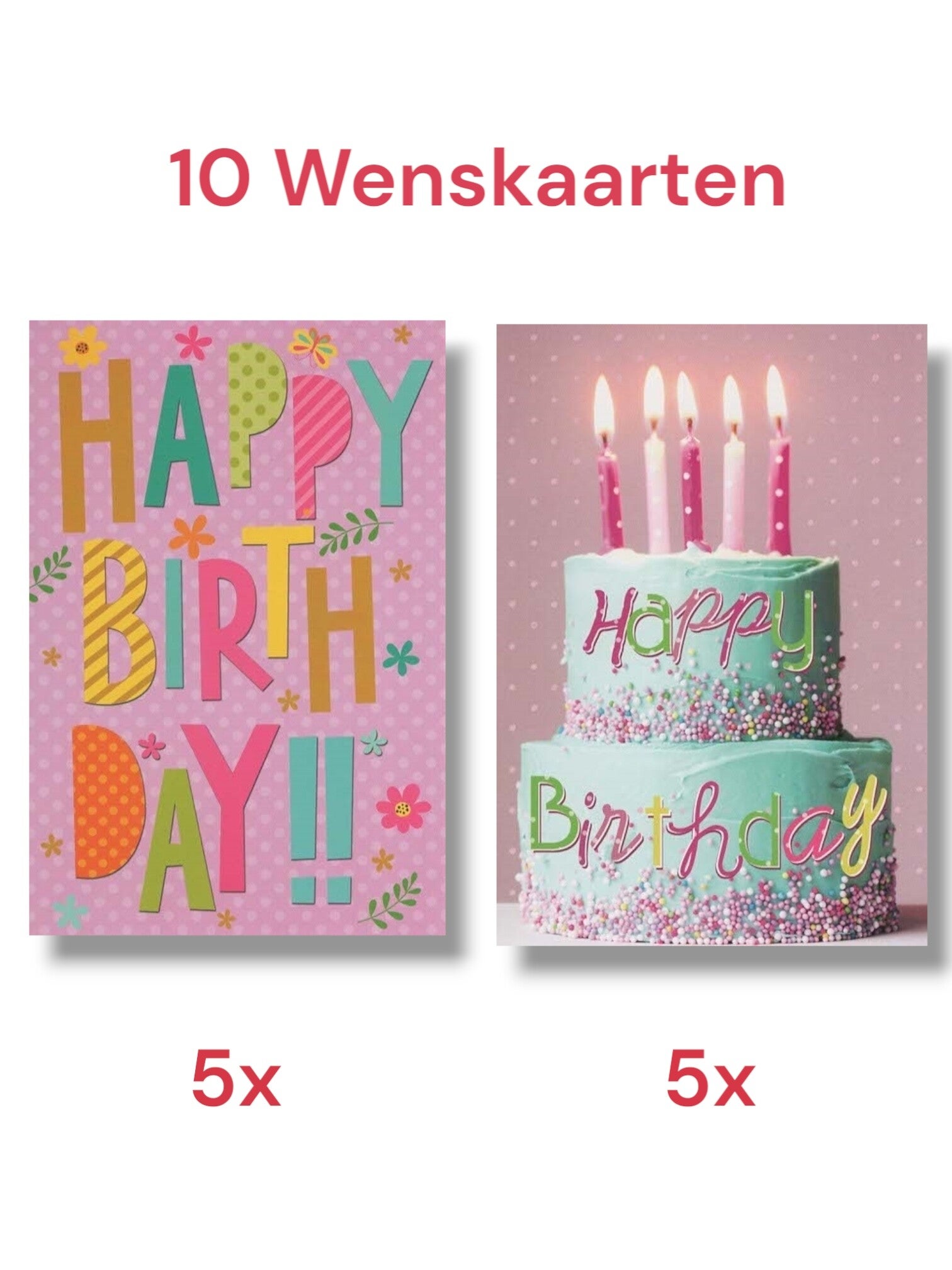 Pakket met 10 (2× 5 st) felicitatie wenskaarten met gekleurde envelop, blanco binnenzijde, afm circa 11,5 x 17 cm.
