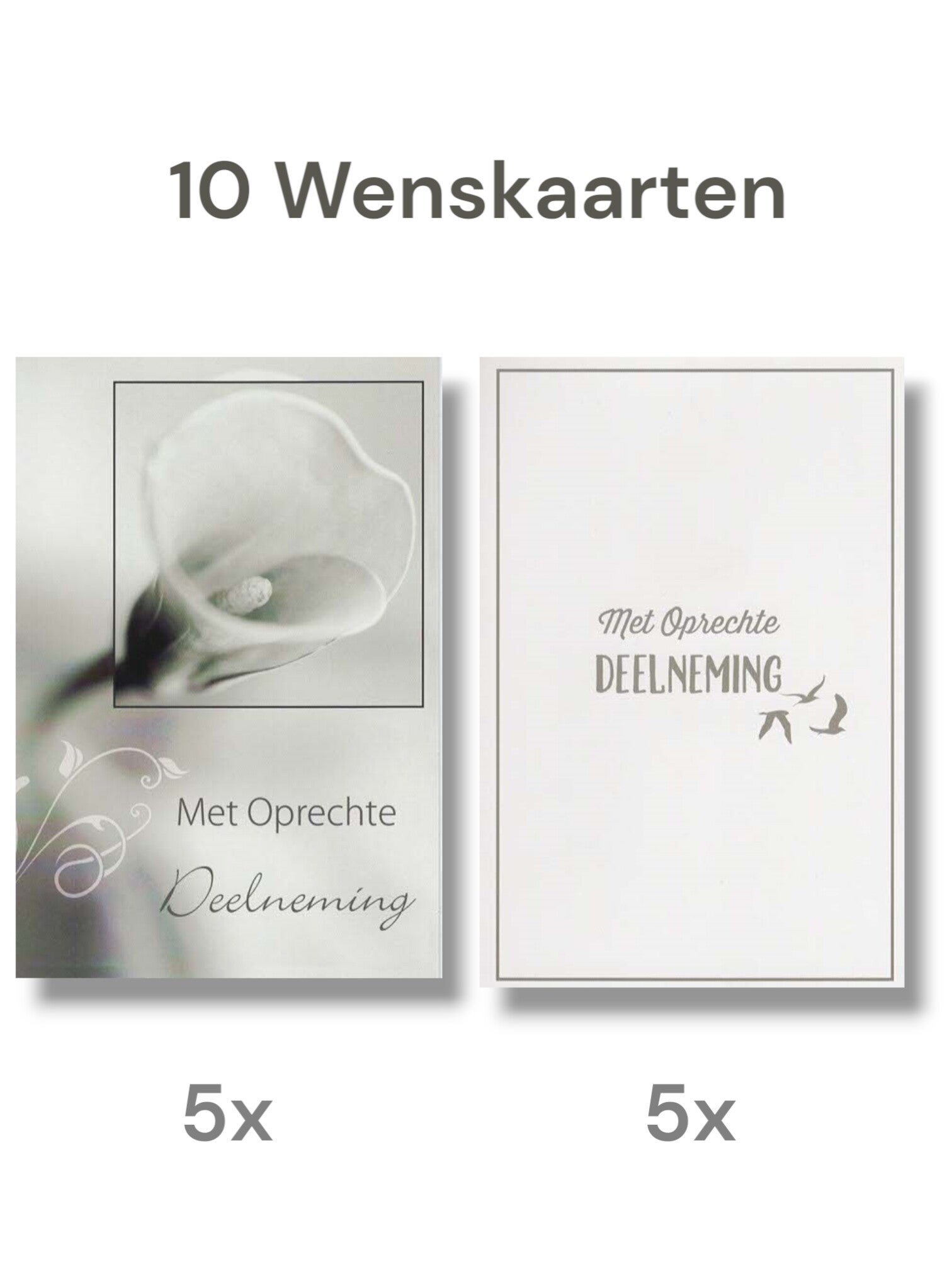 Pakket met 10 deelneming wenskaarten met witte envelop. Blanco binnenzijde, afm circa 11,5 x 17 cm.