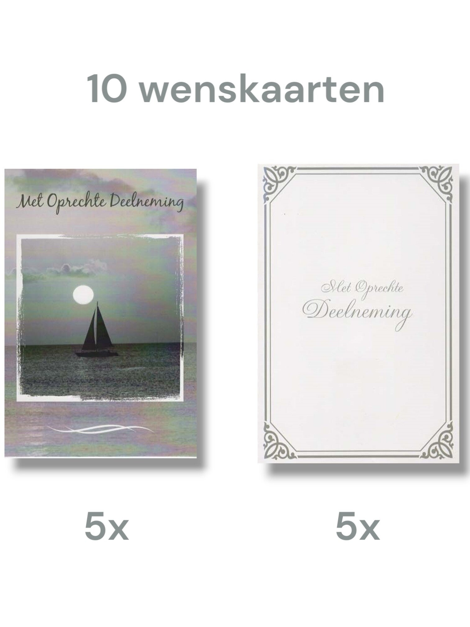Pakket met 10 (2×5st.) Deelneming wenskaarten met witte envelop. Binnenzijde blanco, afm circa 11,5 x 17 cm.